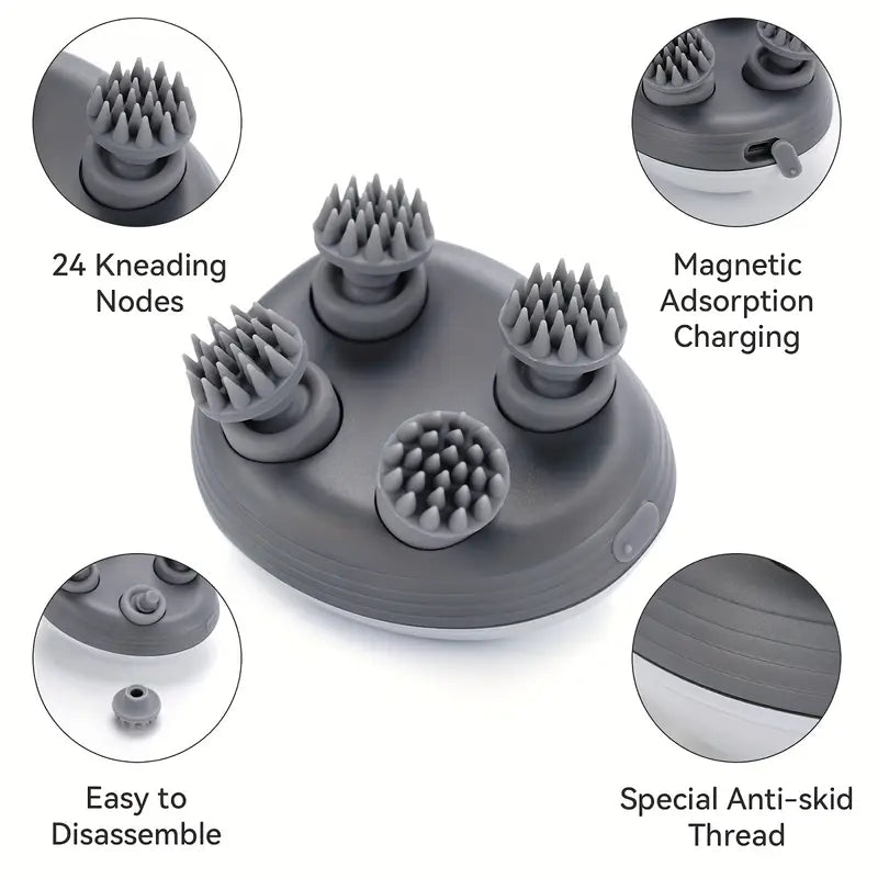 1. Deep scalp and stress relieving massage: Scalp massager features 4 massage heads with 24 individual nodes and 3D Deep-Kneading,perfectly fits the scalp and provides a gently kneading 360°massage experience.
